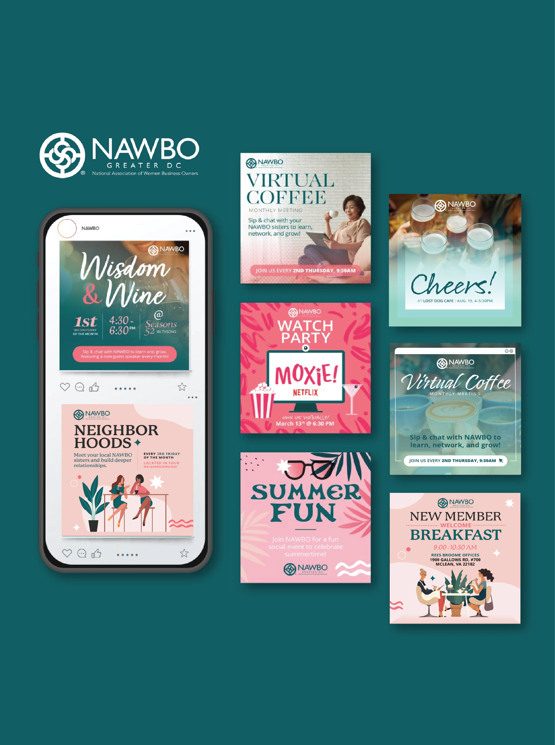 With NAWBO, a women-lead networking group geared towards uplifting women in business, the client has many social ad needs to advertise their get-togethers as well as programs that they run. Their marketing collateral is designed to be fun, feminine and engaging. These are some of my personal favorite projects to work on!