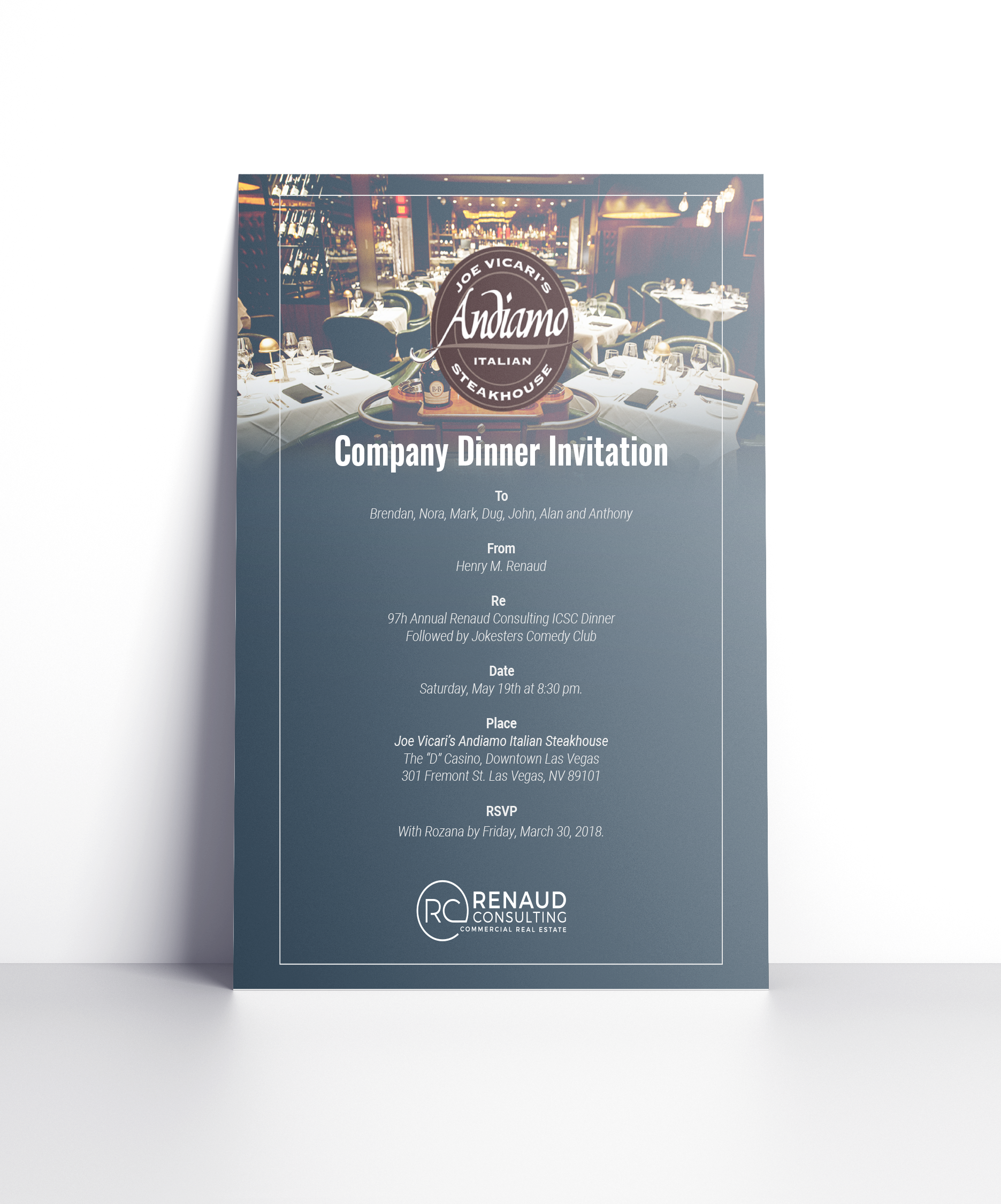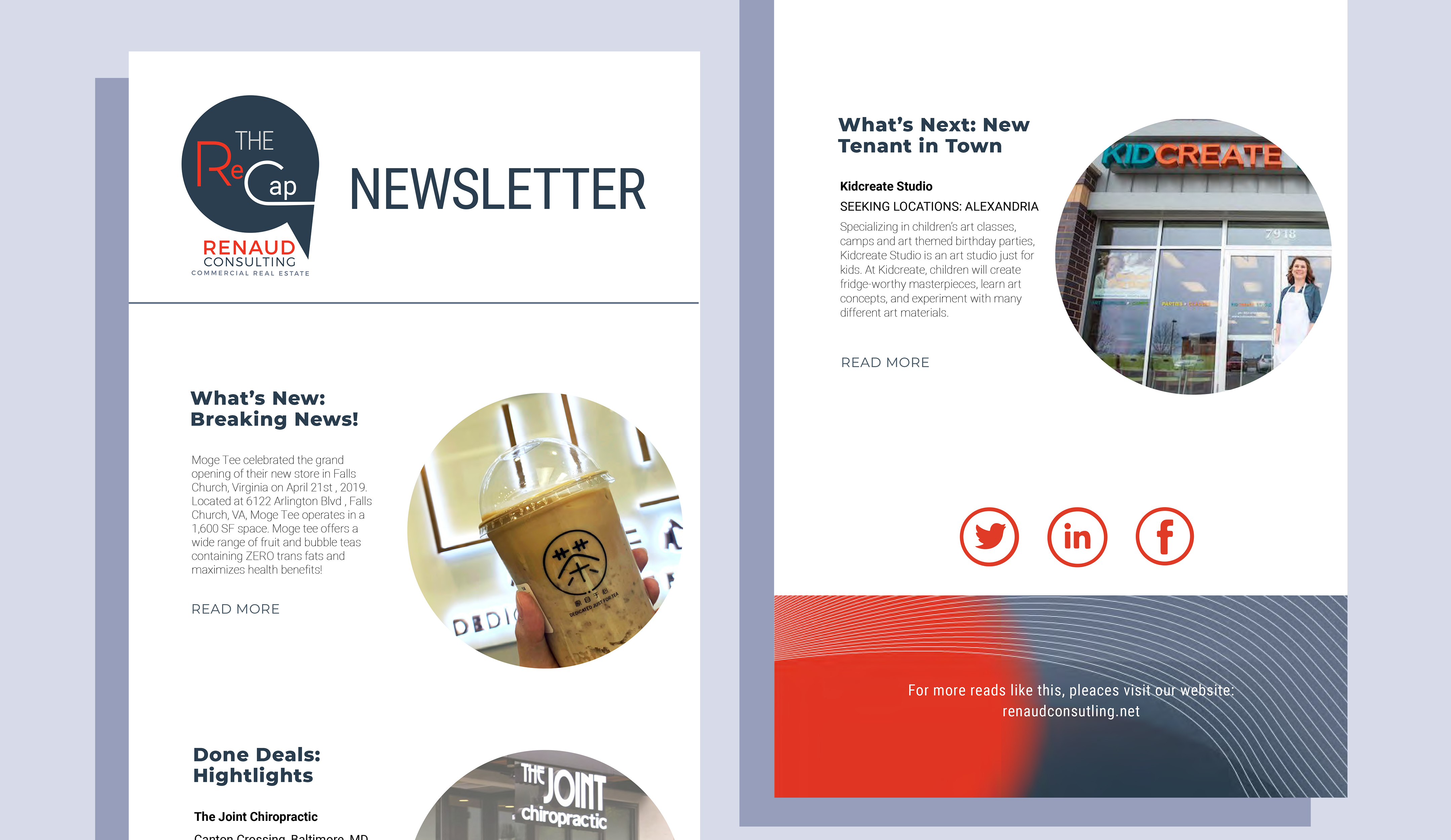 At Renaud Consulting, I was lead designer and marketing specialist. I worked on managing social media, website updates, any and all print marketing materials and event collateral. I was brought on initially to help transition all marketing material to the newly updated brand. Maintaining and building out brand standards was my primary role.